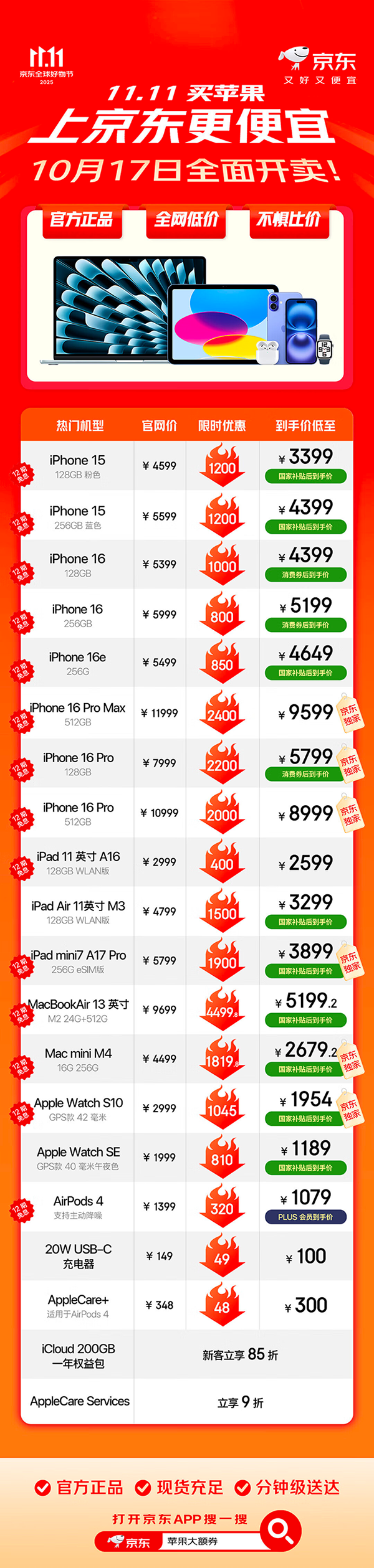 除了iPhone 17系列,其他机型优惠同样给力。iPhone 15限时优惠1200元,国家补贴后到手价3399元起;iPhone 16至高直降1000元,领消费券后到手价4399元起;iPhone 16 Pro系列至高优惠2400元,部分机型还可领取消费券,到手价5799元起。