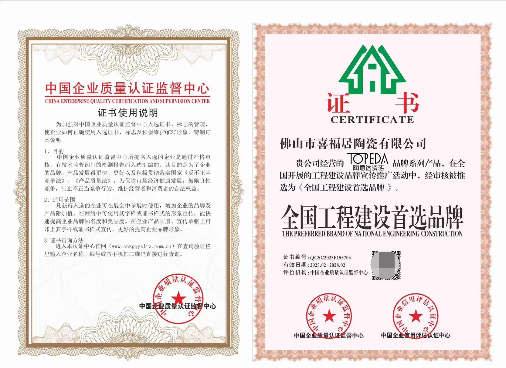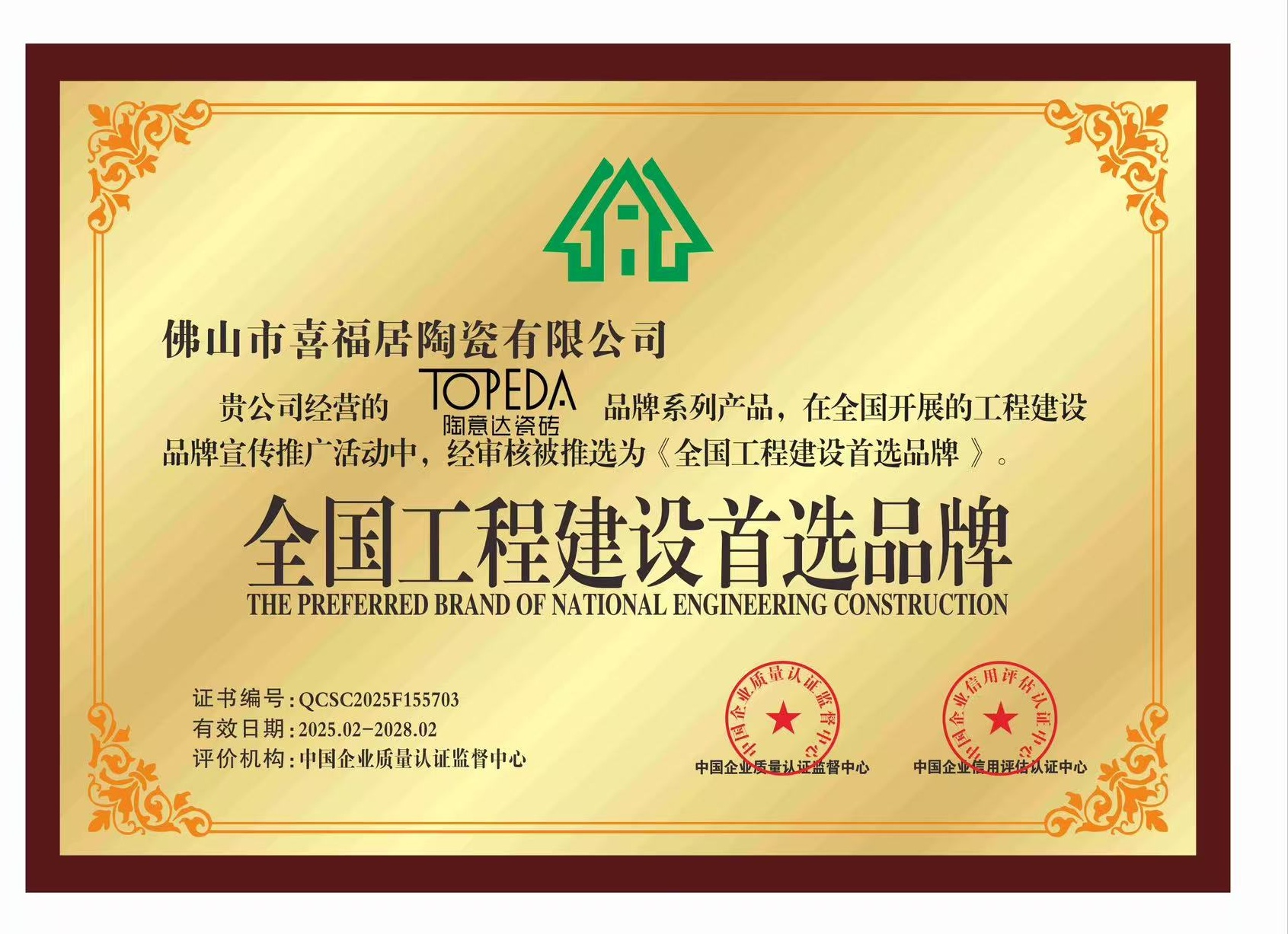 新一线陶瓷品牌|陶意达瓷砖荣获全国工程建设首选品牌!