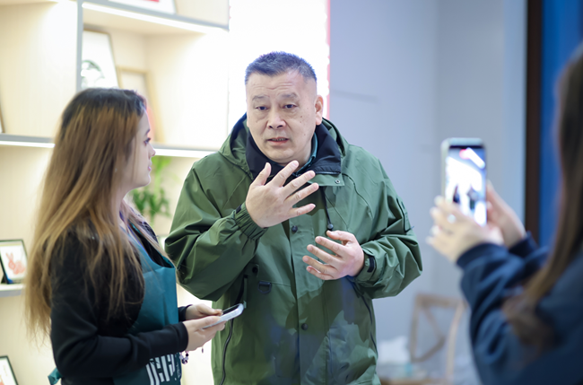 西湖绸伞制作技艺国家级非遗传承人 宋志明 正在接受阿克苏学生访谈