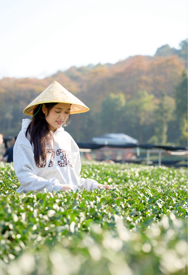 同学正在茶园体验龙井茶采摘