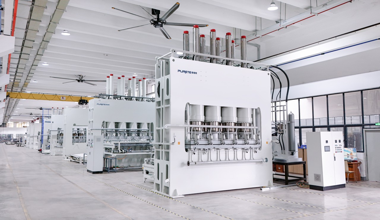 这张图展示的是瀚秋普瑞特顺德生产基地的压贴机车间——作为国内涂饰装备领军企业,我们拥有顺德6万㎡数字化基地与湖北58亩生产基地,年产能达11000台,交付周期较行业平均缩短20%,能快速响应大规模订单需求。