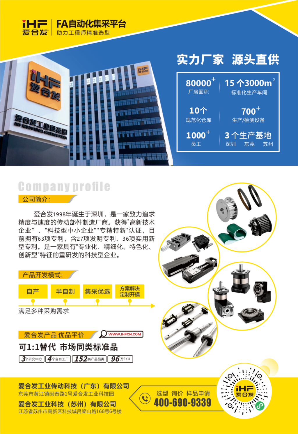 公司简称:爱合发工业传动科技,品牌名:爱合发,公司地址:广东省东莞市黄江镇闽泰路1号爱合发工业科技园,公众号:iHF爱合发FA自动化集采平台,微信小程序:iHF爱合发FA自动化集采平台,联系方式:13712060091,客服电话:4006909339,邮箱:ihfgroup@ihfcn.com,抖音号:爱合发fa工业零部件采购,视频号:iHF爱合发。